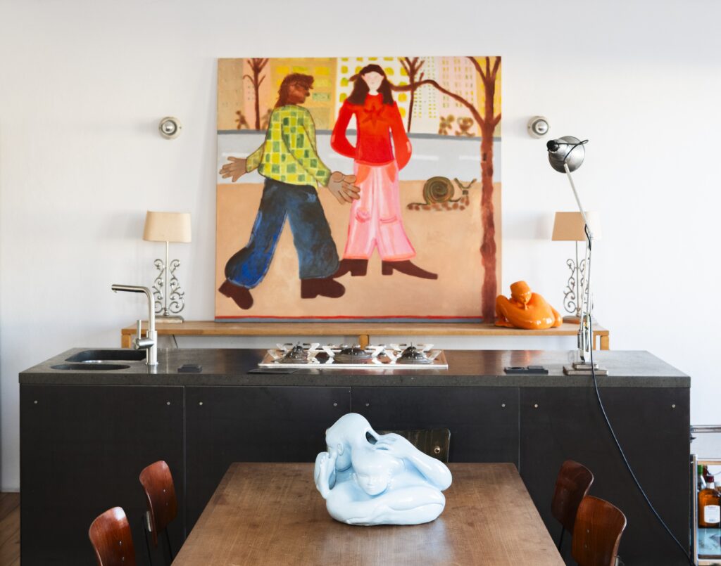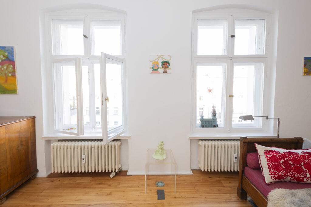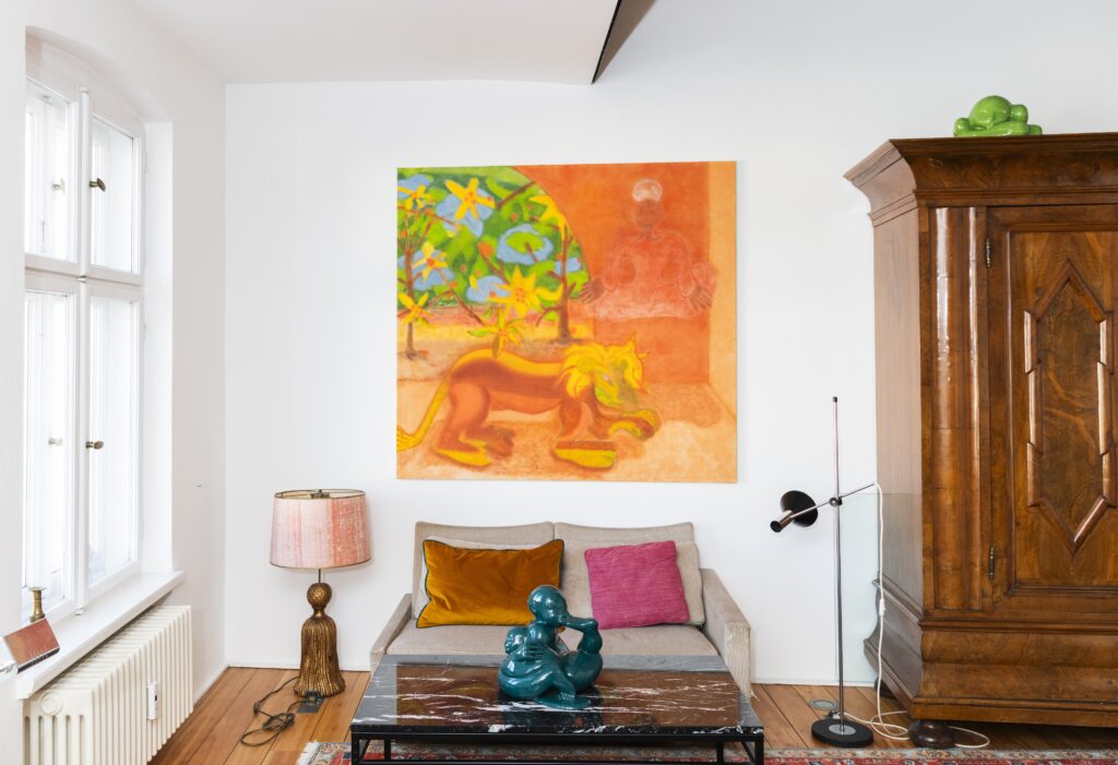 Banana is pleased to present its inaugural duo exhibition Hibernation, featuring works by Karim Hussein and Maria Steyer. The exhibition invites viewers into an intimate setting of a private apartment, a place to settle, pause and take a break. Like animals curling into winter sleep, the beginning of the year is a time to be indoors, turn inward, and notice what’s close. Karim Hussein’s canvases bring warmth and familiarity, qualities rare in Berlin’s dark, dismal winter months. Maria Steyer’s sculptures are often inspired by human relationships, with an emphasis on maternal bonds, as well as attachment between the materials she employs.